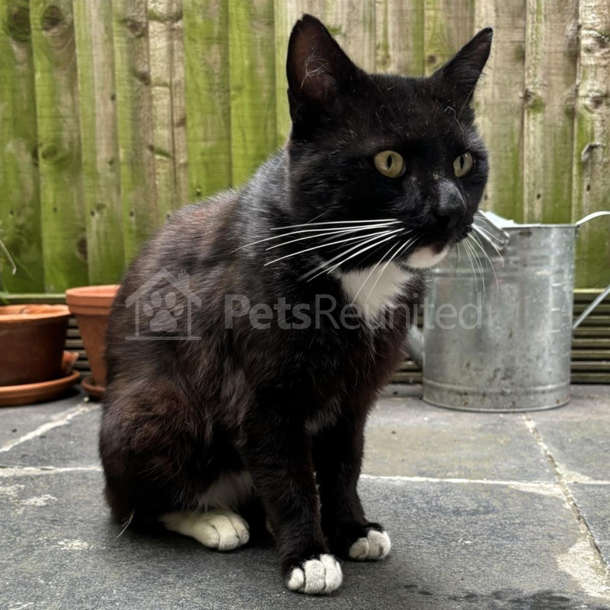Circumstances: This cat came into our fenced garden yesterday afternoon and miaowed loudly. We have a young cat who was outside and she was quite stressed by this although the black cat did not seem disturbed at all, in fact he/ she seemed friendly and domesticated and keen to come inside our flat. They came by again this morning. The cat isn't wearing a collar and looks hungry and a little raggedy with a scratch noticeable on their tail. They are mostly black with white paws and a white patch on their chest.