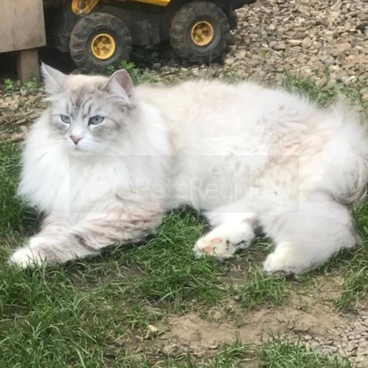 White, silver and brown Domestic long-haired cat