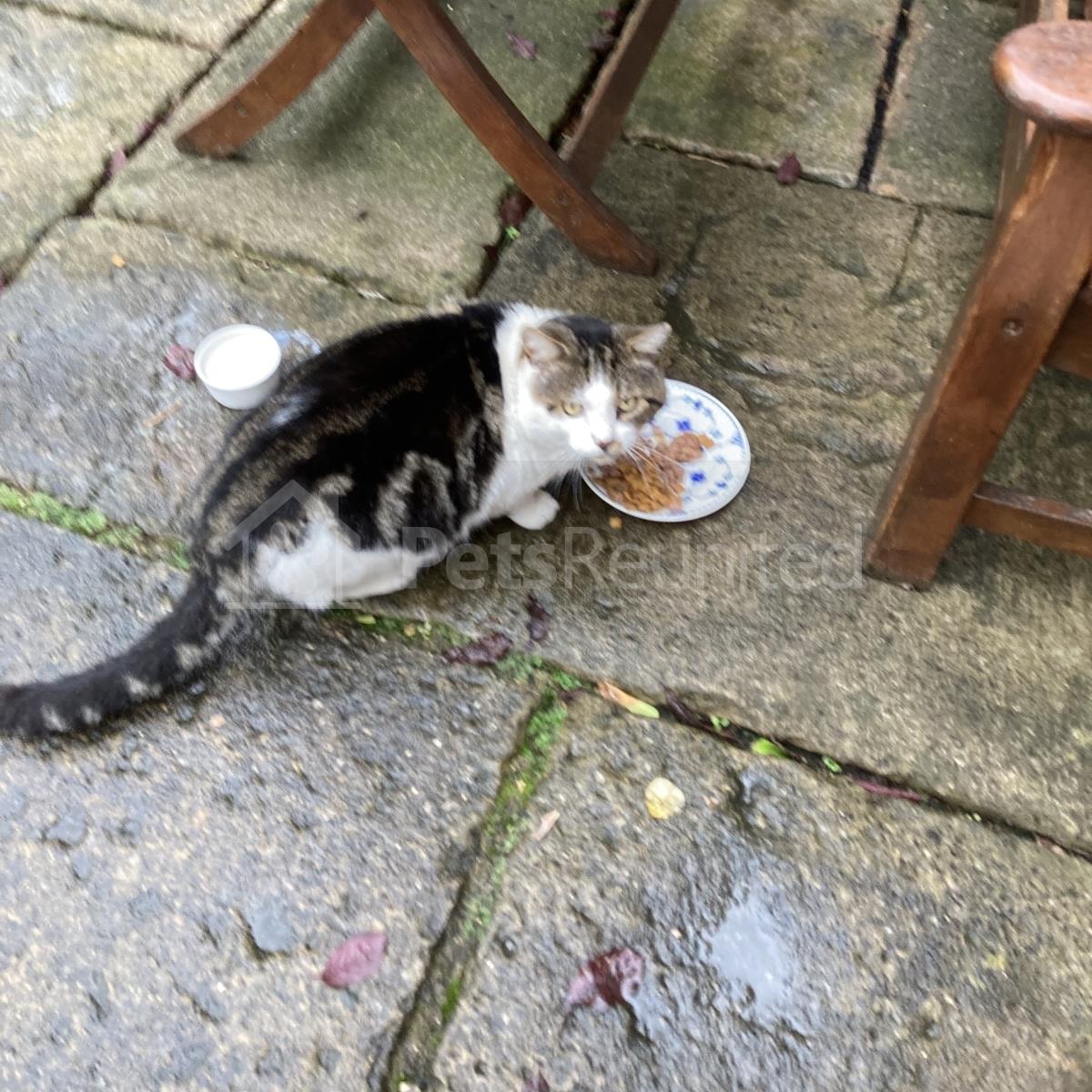 Other info: Has a large white and black face. Quite a chubby cat.