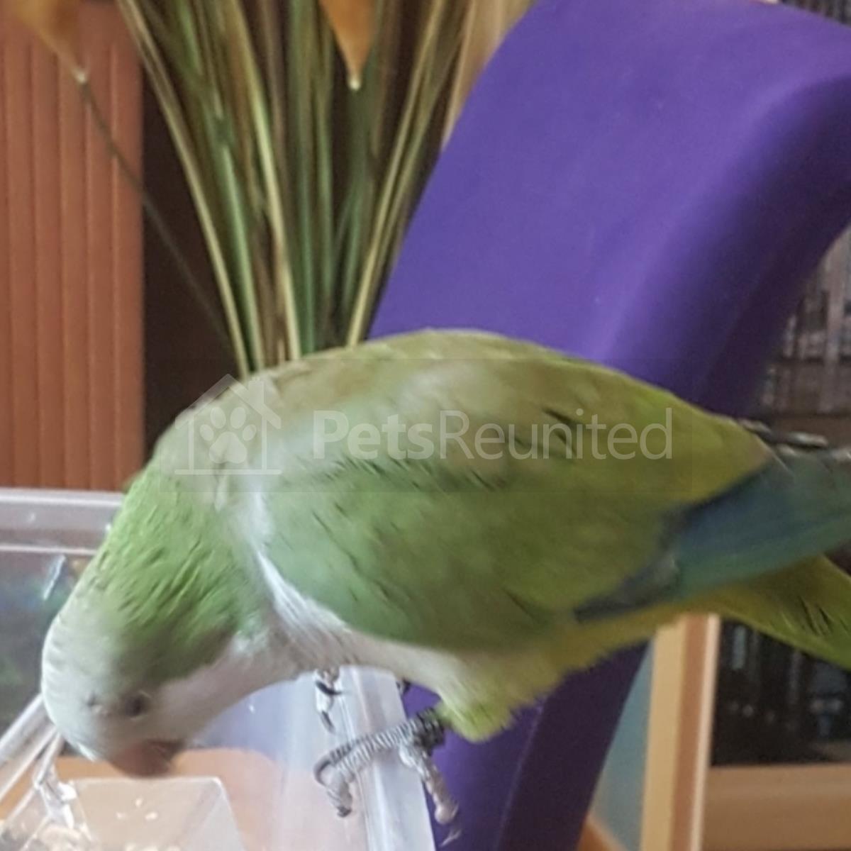 Green and white with blue tail Quaker parrot