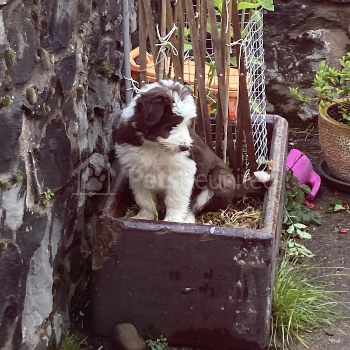 Dark Brown and white Bearded Collie dog