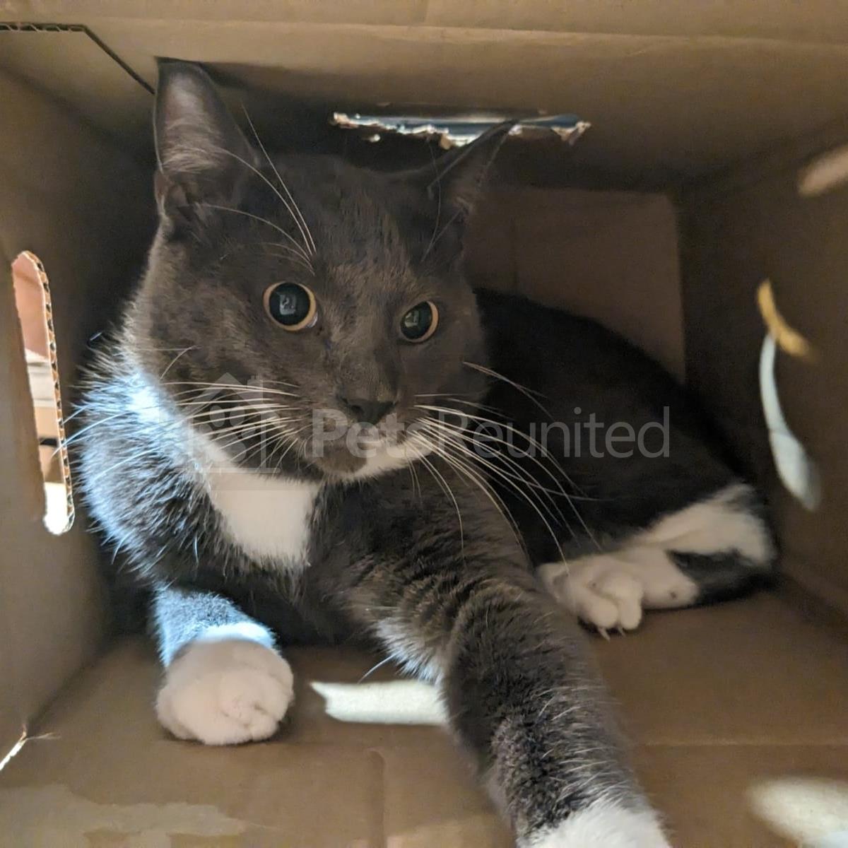 Grey fur, white belly & feet cat