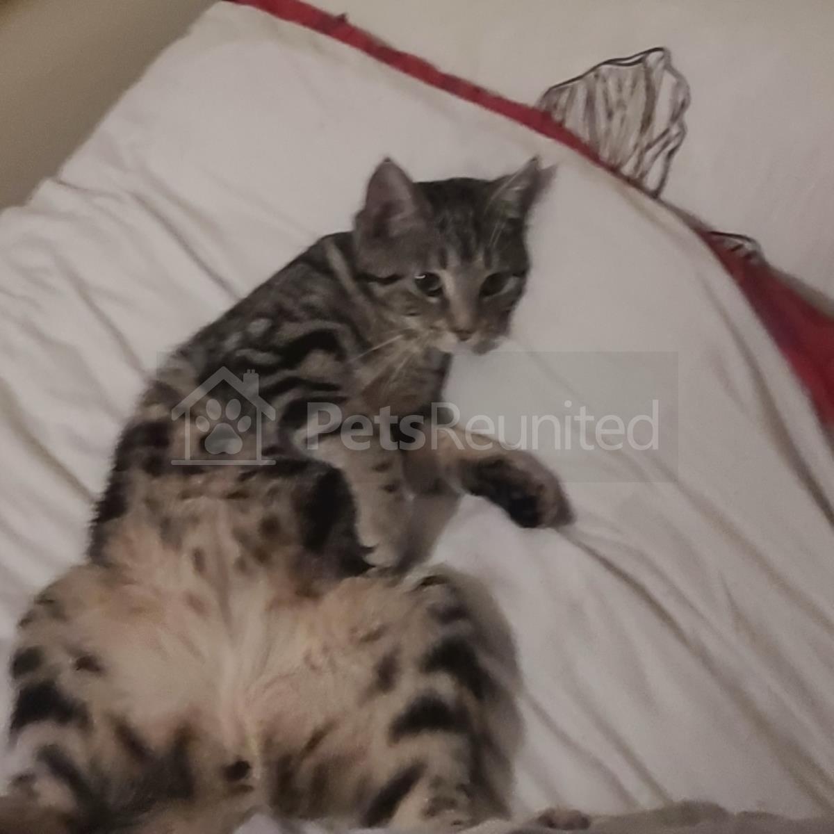 Grey with black spots/stripes Bengal cat
