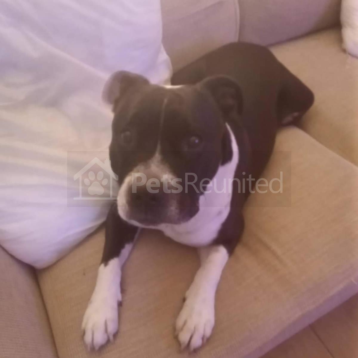 Black and white Staffordshire Bull Terrier dog