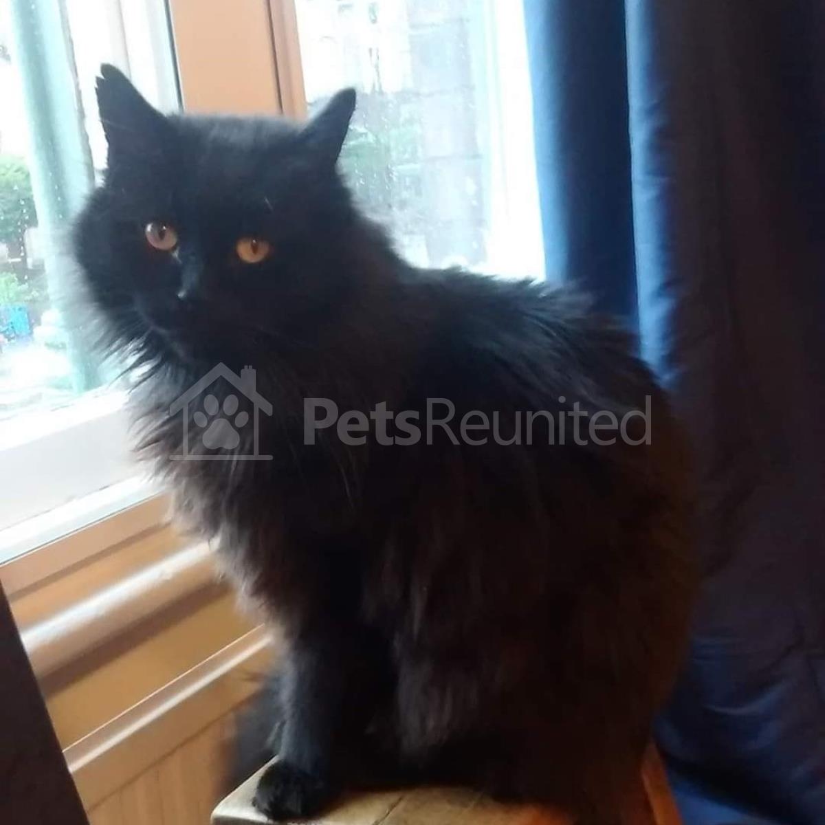 Markings: Big, black, fluffy and longhaired. Tip of right ear is partially torn in two places. Amber eyes but can look green depending on the light.