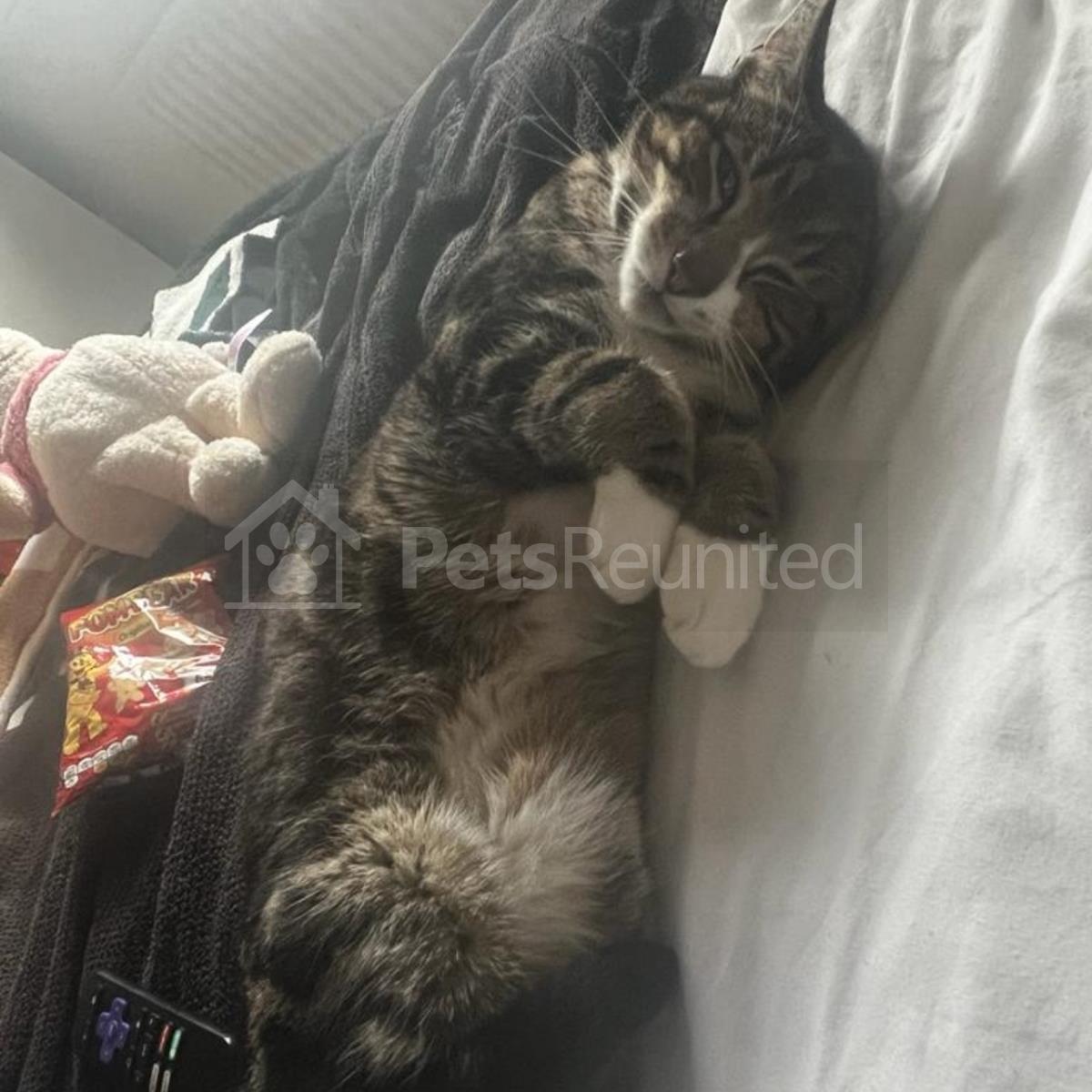 Grey/white/ black, white feet cat