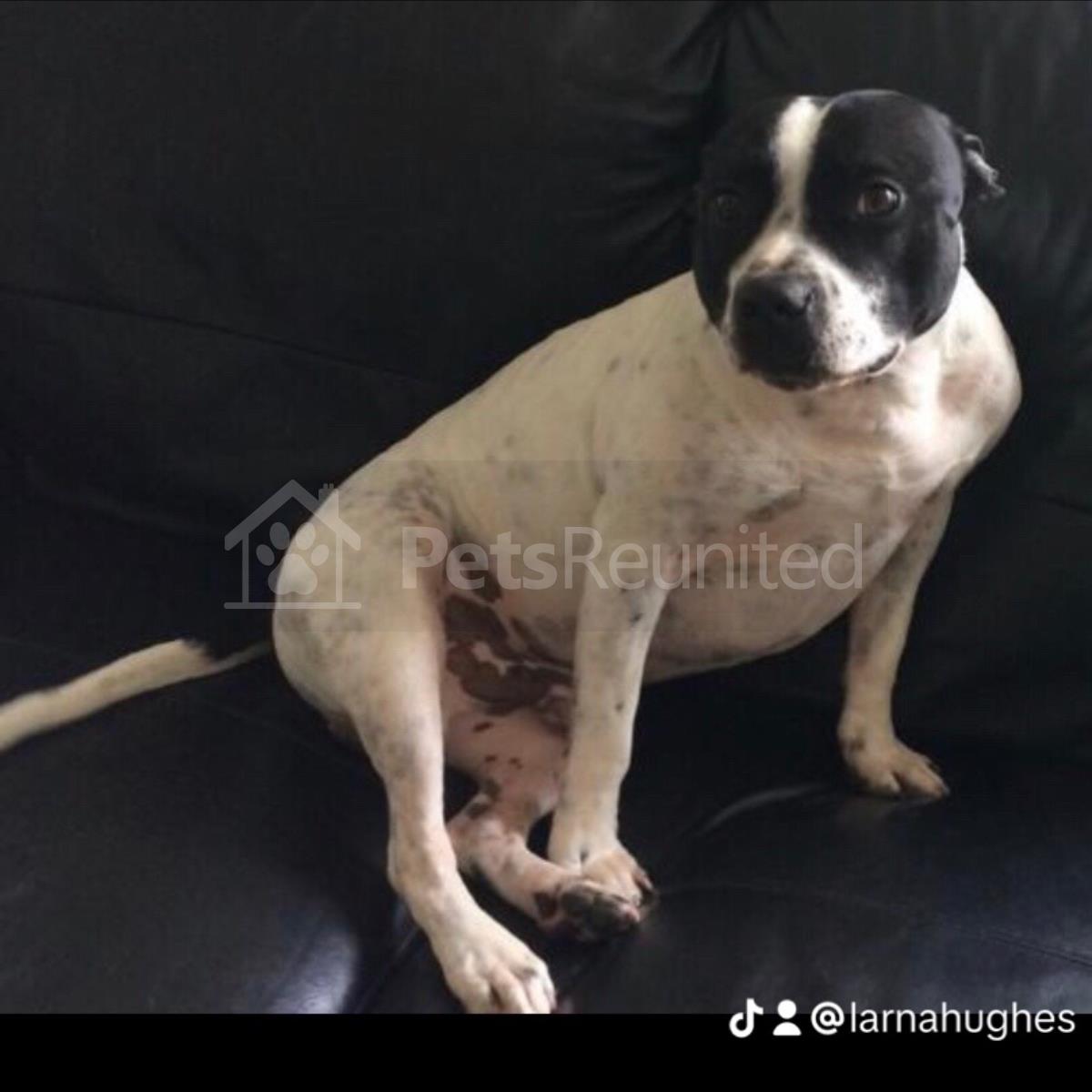 Black and white Staffordshire Bull Terrier dog