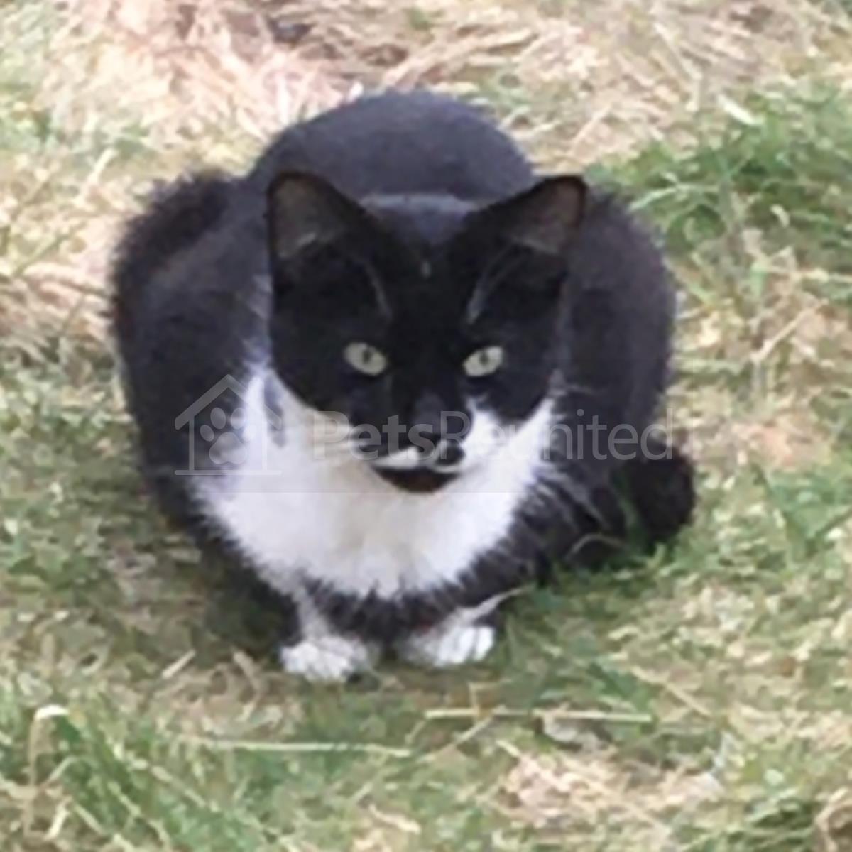 Other info: Young slender "Tuxedo" appearance black and white cat Black body, white under-chin area with a black smudge. White throat, chest and tummy and four white paws. White areas either side of mouth with a small black dot on the left side.