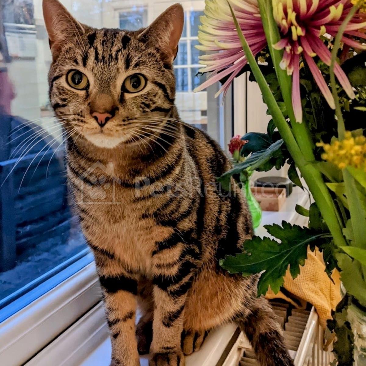 Grey with black stripes Domestic short-haired cat