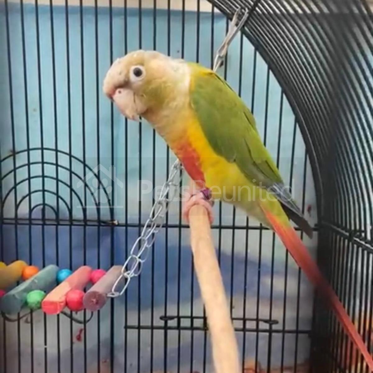 Green, yellow and red Green-cheeked Conure parrot